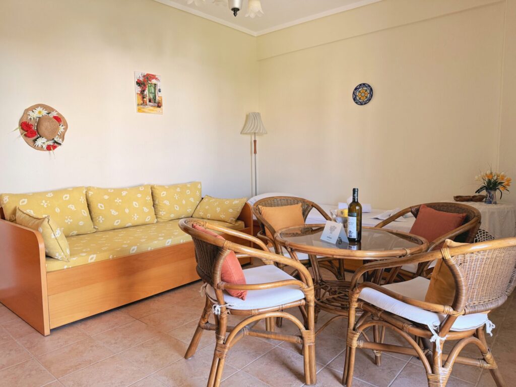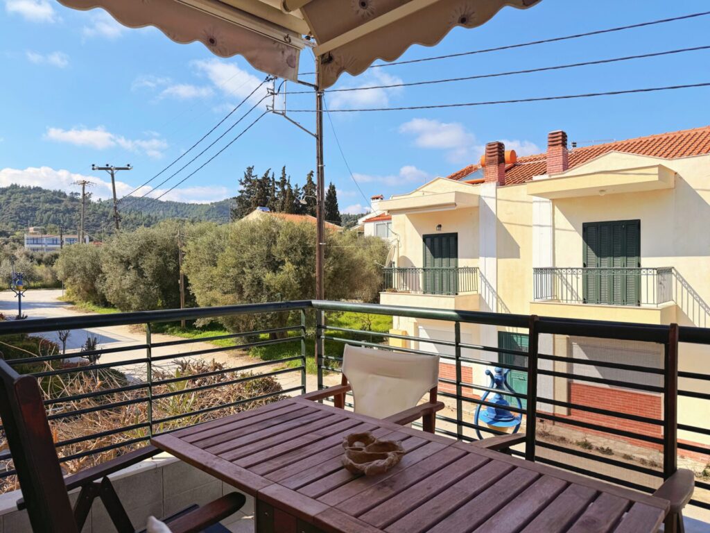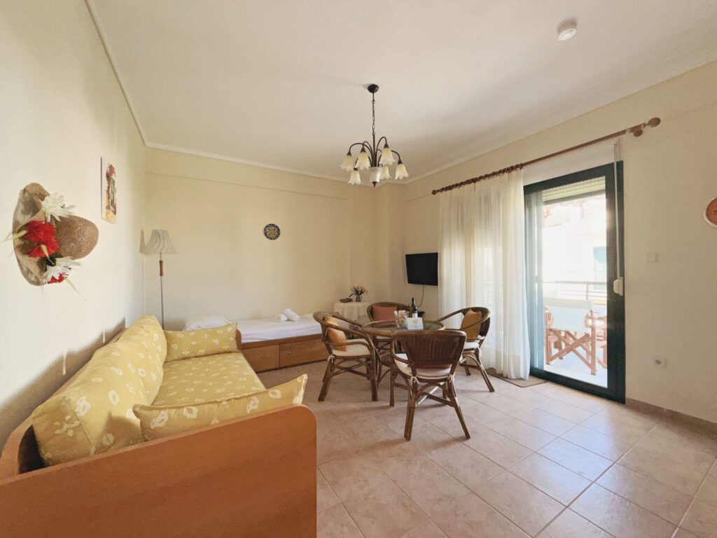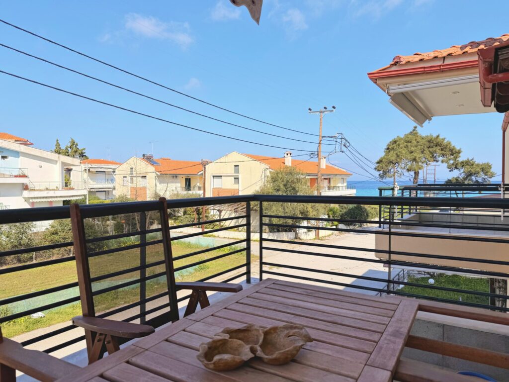 This apartment is located in Polychorno, Halkidiki, just 2’ away from the sea and its crystal clear waters. Going up to the first floor you will find the apartment which has 1 bedroom with a double bed, 1 bathroom with shower and a spacious and fully equipped living room and kitchen. The living room has a double sofa bed and a single.
