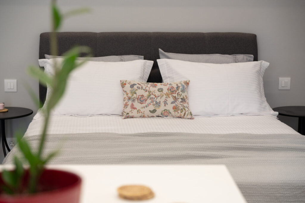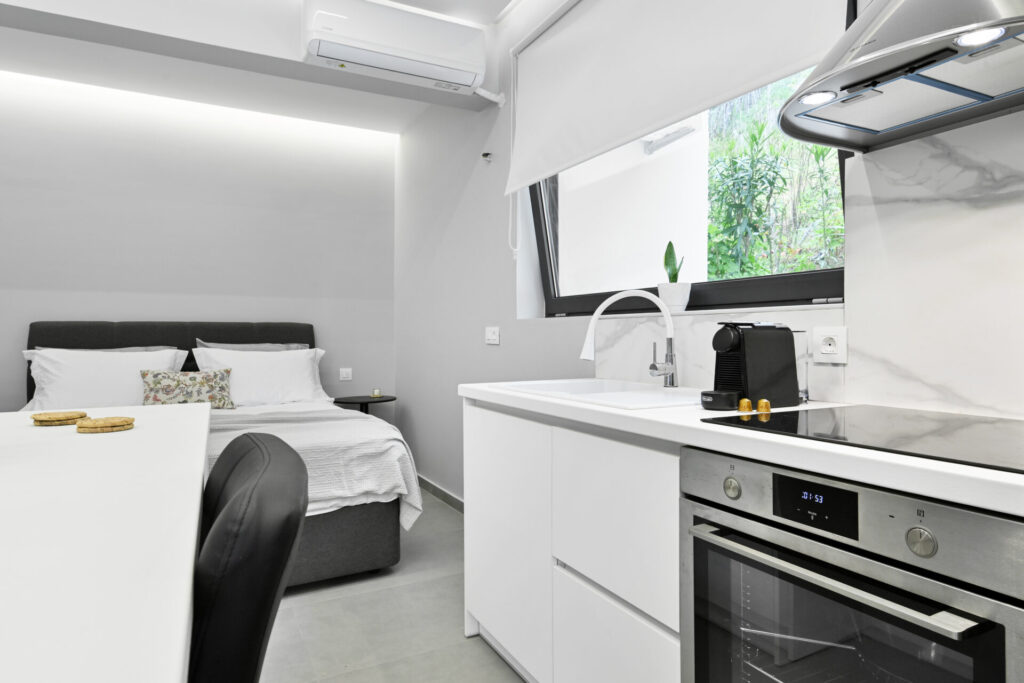 This is a 35 sq.m. studio that can comfortably accommodate 2-3 people. Entering the space, you find the bright and modern kitchen, fully equipped with everything you need to prepare meals, from breakfast to dinner, in a welcoming area. The space includes a comfortable double bed as well as a large armchair that converts into a single bed. Finally, the studio also features a modern bathroom with a shower.