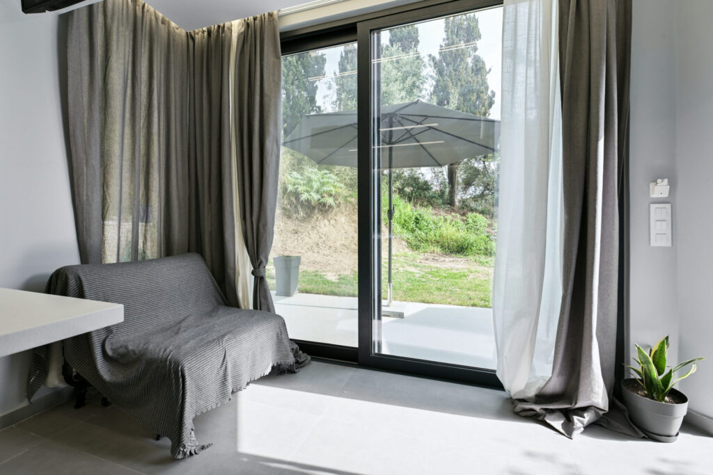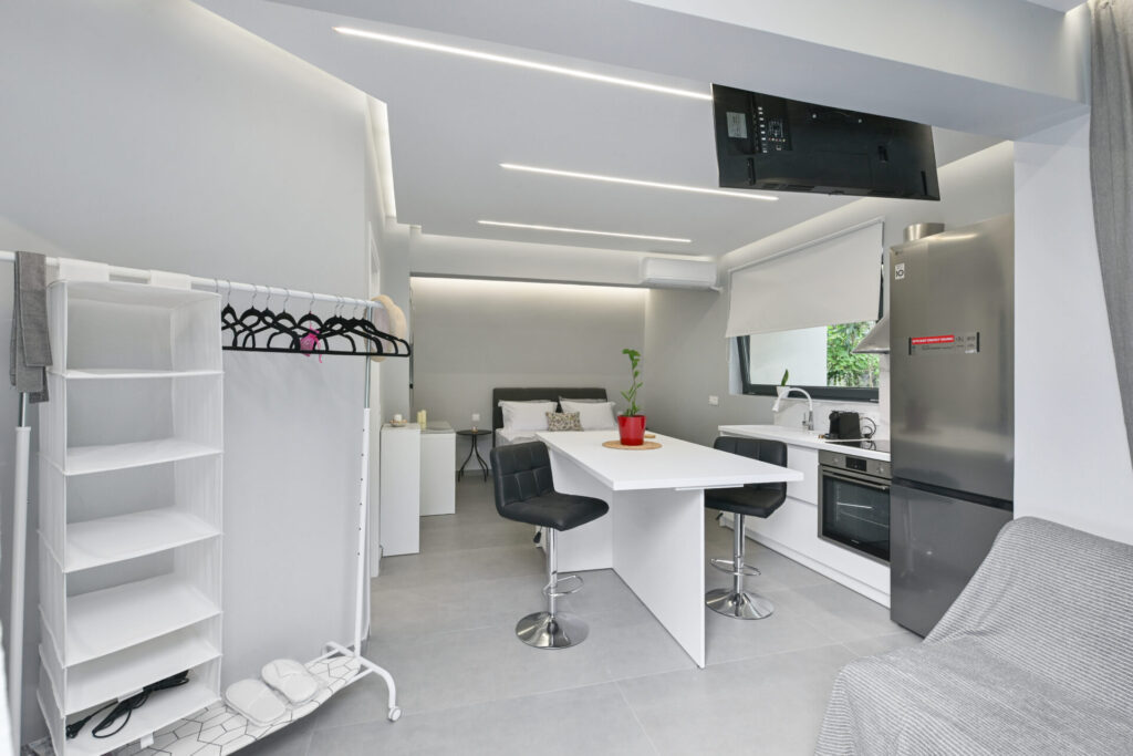 The studio includes a sunlit terrace that connects with the shared garden of the building, where there is an outdoor seating area where you can enjoy unique evenings with friends and family, a morning coffee, or relaxing sunset drinks.