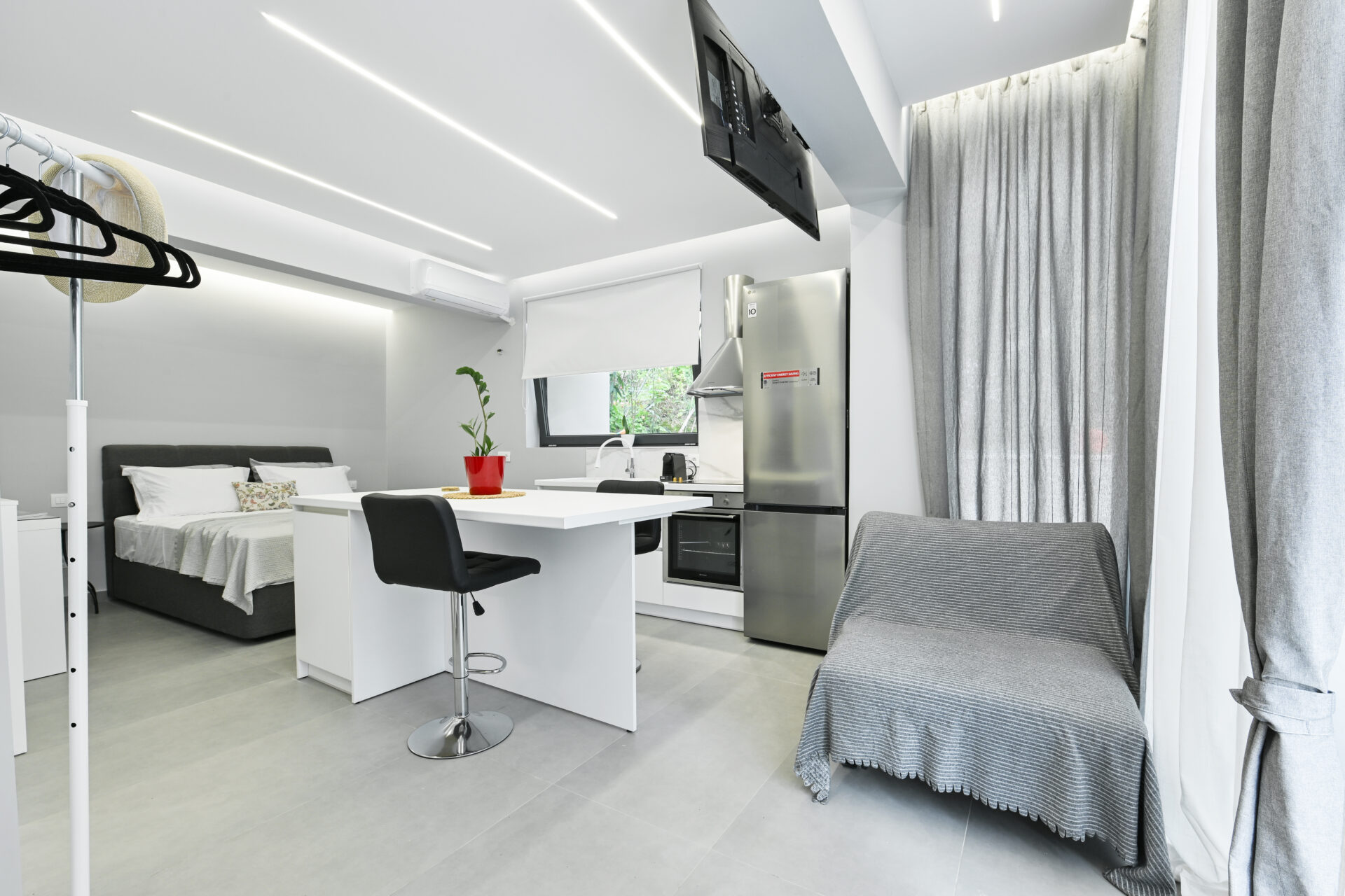 This is a 35 sq.m. studio that can comfortably accommodate 2-3 people. Entering the space, you find the bright and modern kitchen, fully equipped with everything you need to prepare meals, from breakfast to dinner, in a welcoming area. The space includes a comfortable double bed as well as a large armchair that converts into a single bed. Finally, the studio also features a modern bathroom with a shower.