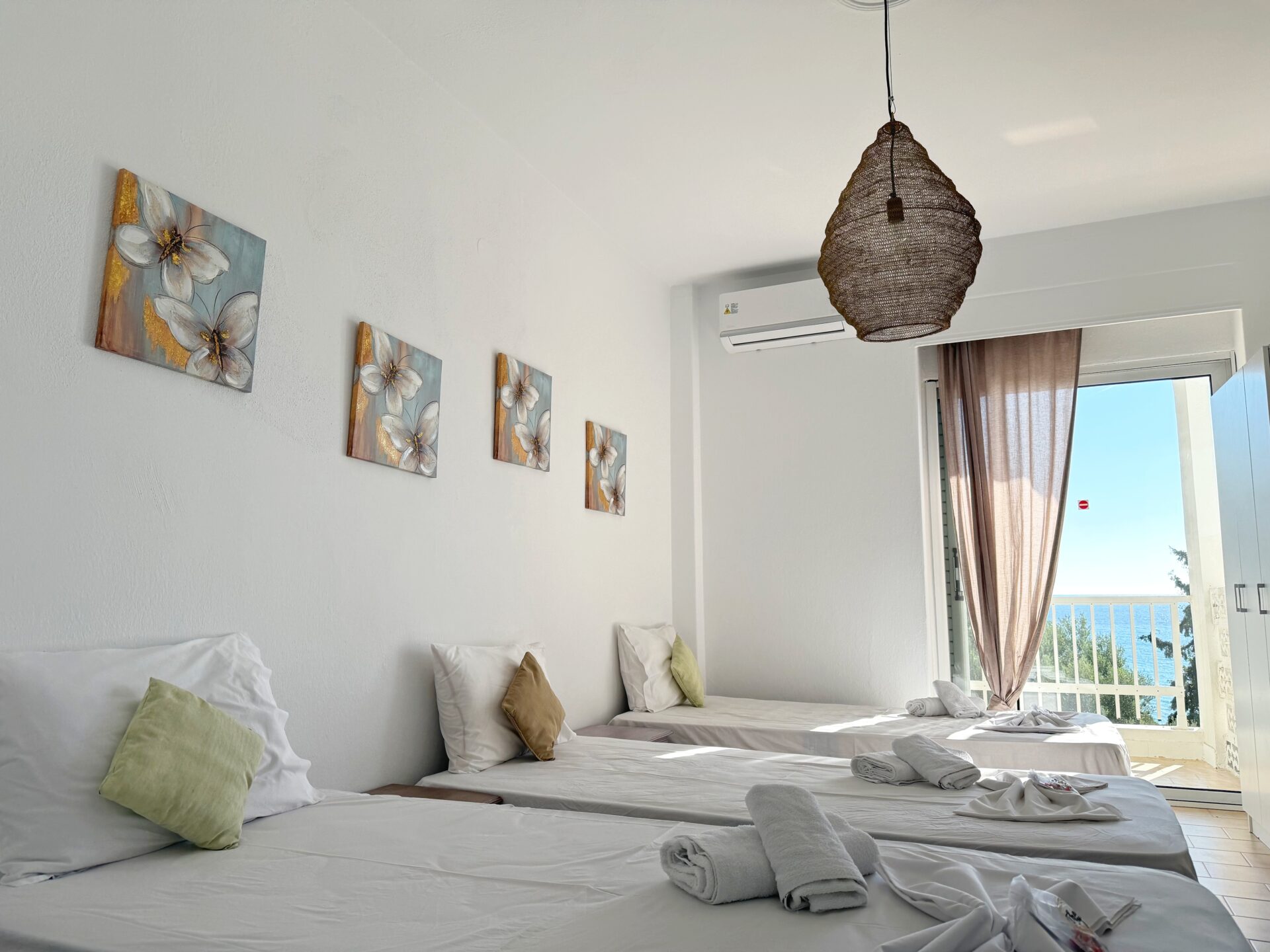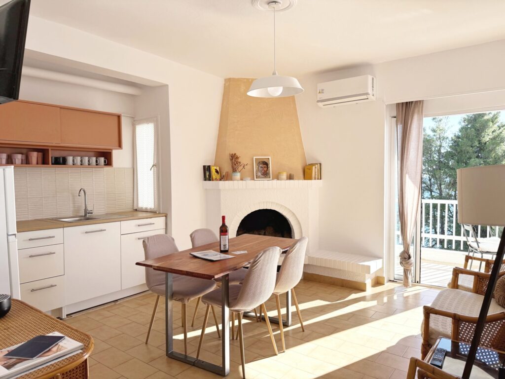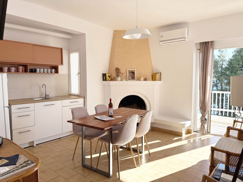 This apartment is located in Mola Kalyva, Halkidiki, just 10 steps from the sea and its crystal clear waters. Going up to the second floor you will find the apartment which has 3 bedrooms (2 with double beds and 1 with 3 single beds), 1 bathroom with shower and a spacious and fully equipped living room and kitchen. On the cooler days of the year, the fireplace in the living room creates a warm and relaxed atmosphere.