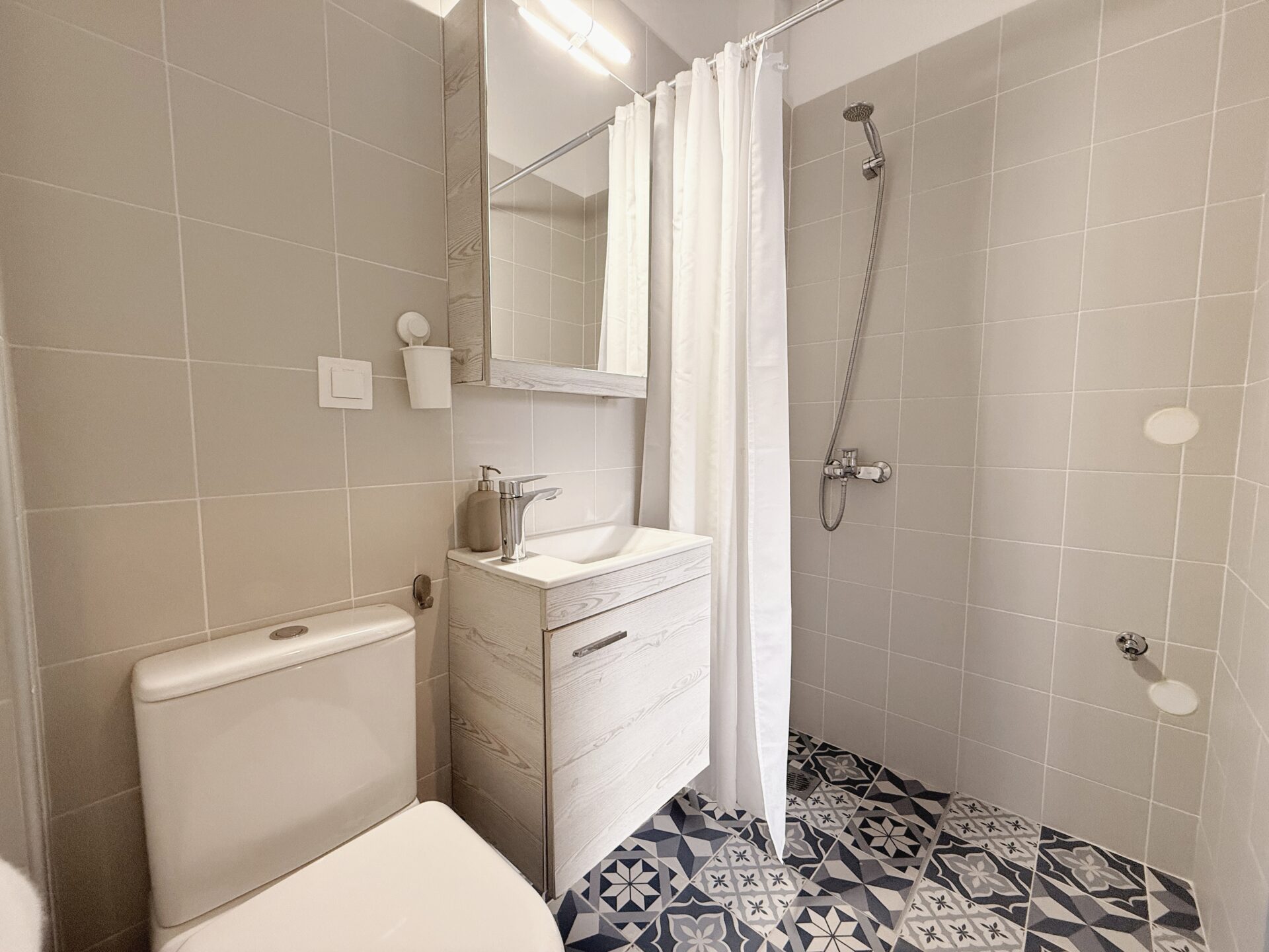 This apartment is located in Pefkochori, Halkidiki, just 1’ away from the sea and its crystal clear waters. Going up to the 1st floor the apartment is to your right. When you enter you will come across 1 bedroom with a double bed, 1 bathroom with a shower and a fully equipped living room and kitchen. In the living room you will find a double sofa bed.