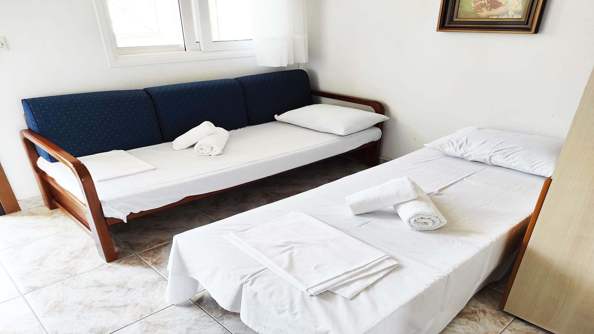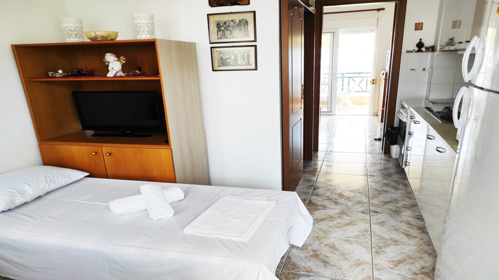 This cozy 2nd floor apartment in Kallithea, offers peacefull family vacations in Halkidiki. It has a bedroom with double bed, a shower bathroom, fully equipped kitchen and a 2 single sofa beds . In the outdoor sunny balcony you can enjoy your coffee and your meals.