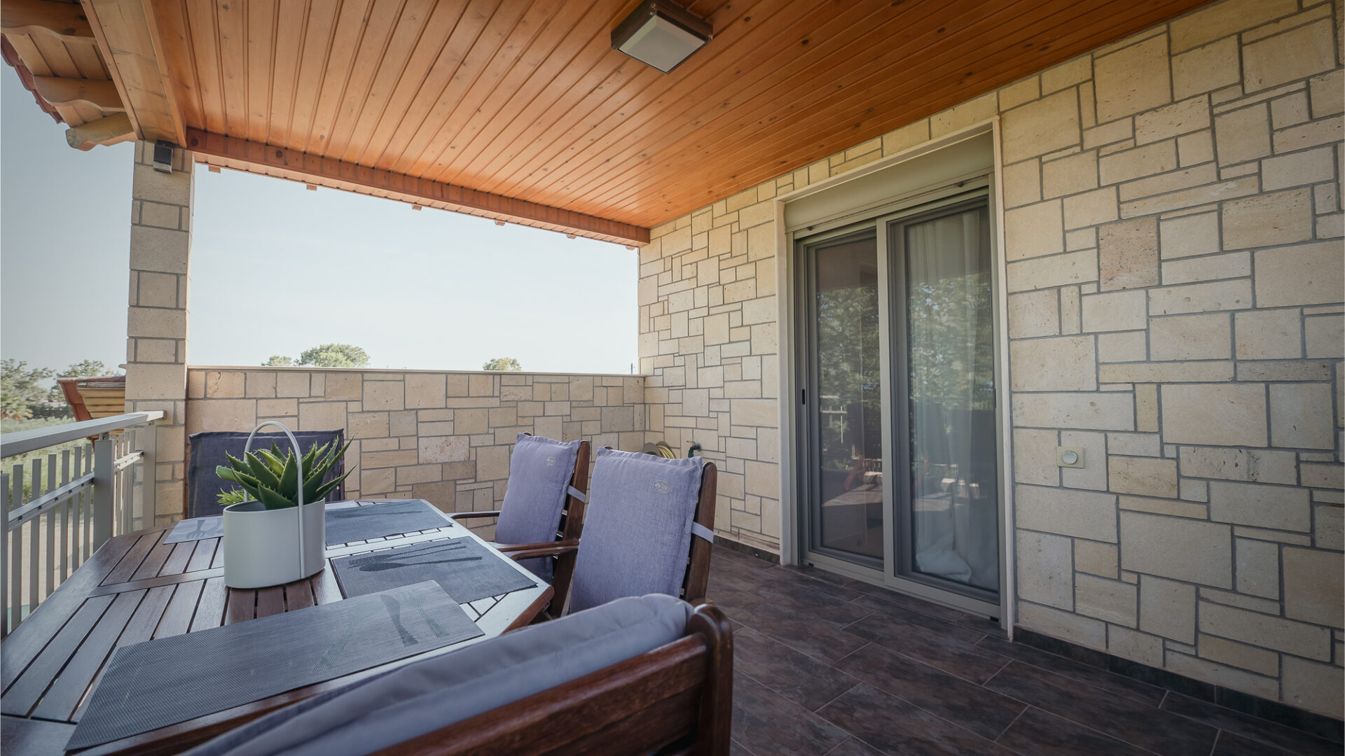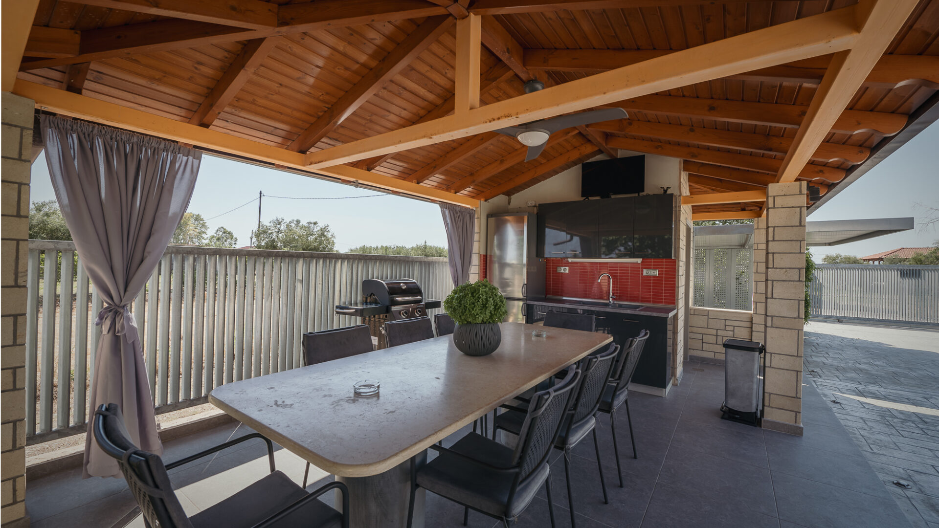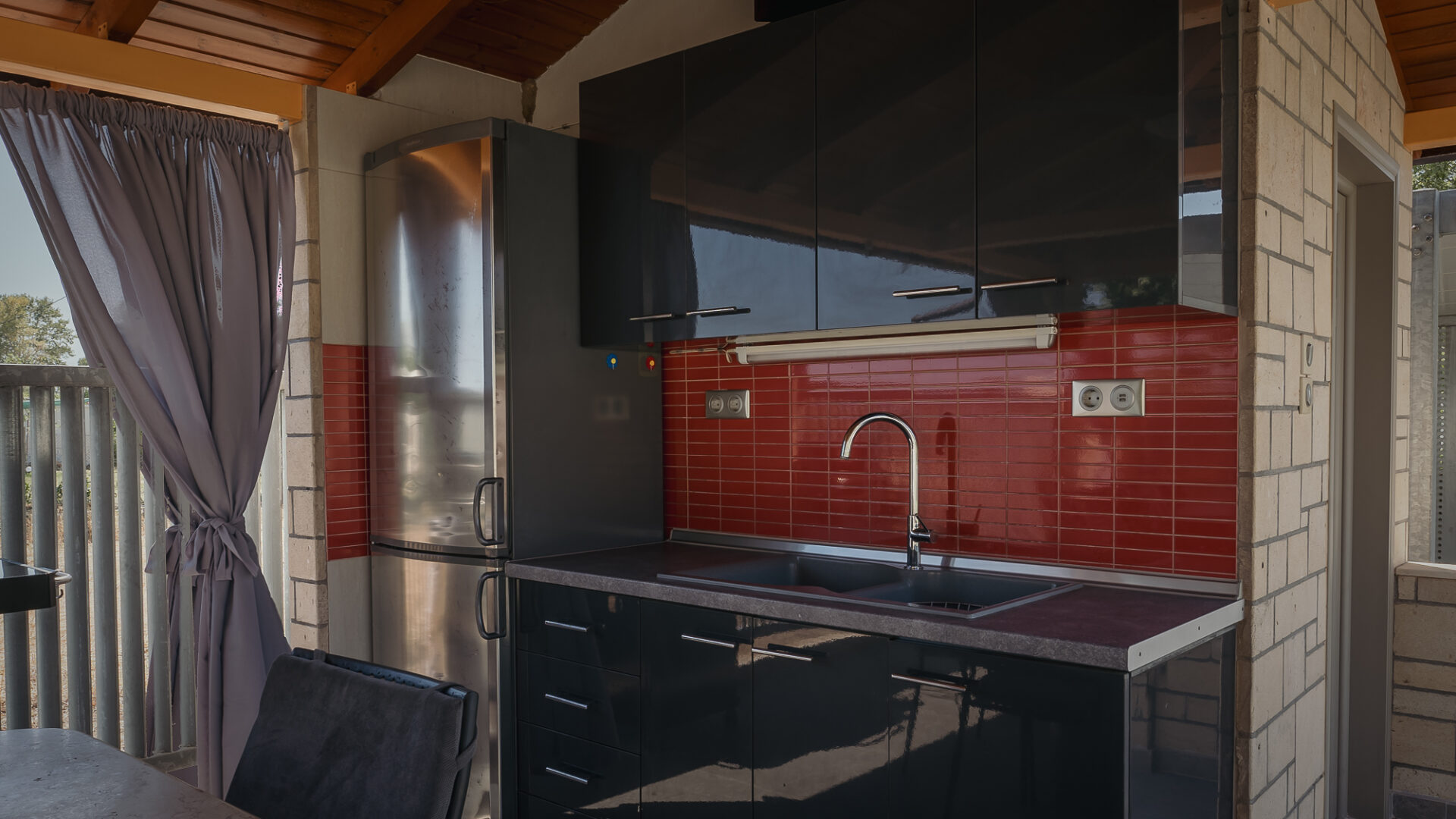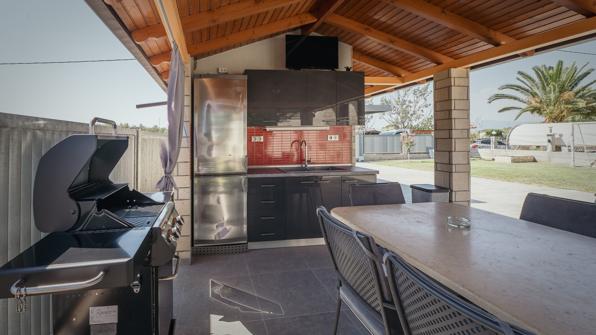 The villa is surrounded by a large, lush green garden that invites moments of relaxation and play. In the garden there is a comfortable gazebo with a gas grill, an auxiliary kitchen with a refrigerator, and a large dining table where you can enjoy unique moments with friends and family. Next to the gazebo there is also an outdoor bathroom with a shower. Additionally, the house has a large veranda with a dining area as well as a large balcony with a view of the sea and the garden of the residence.