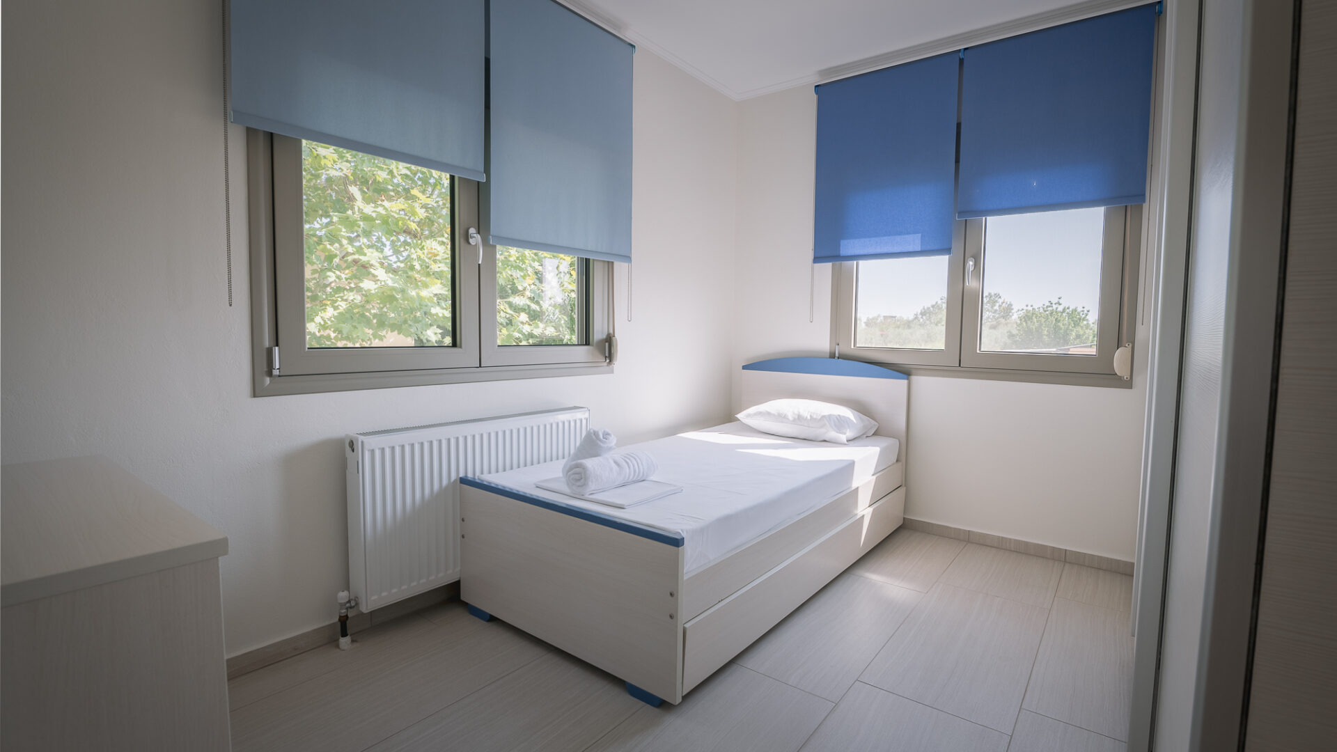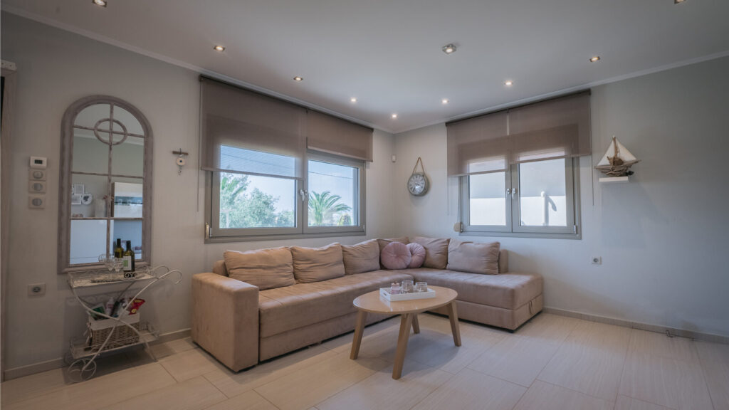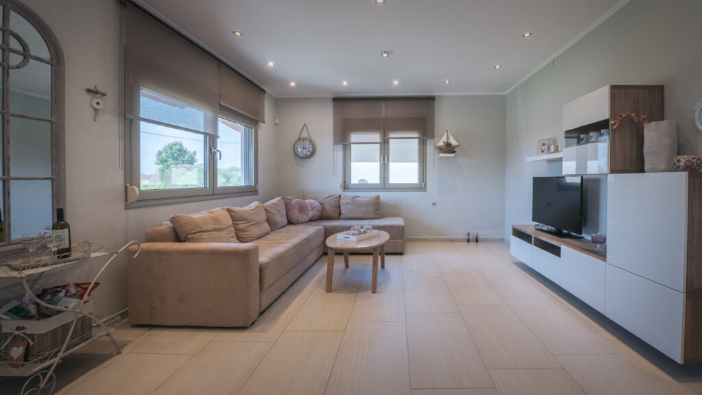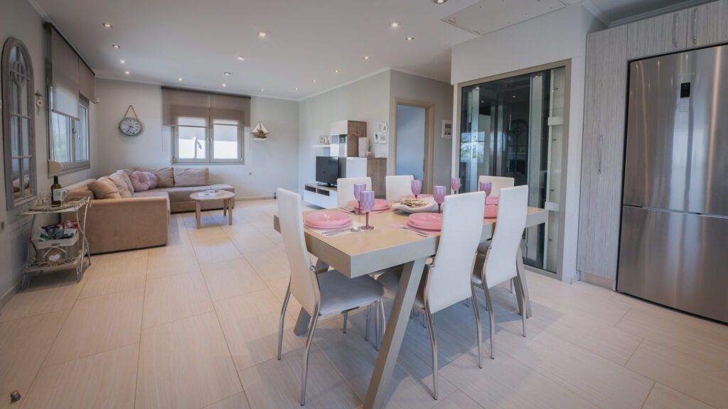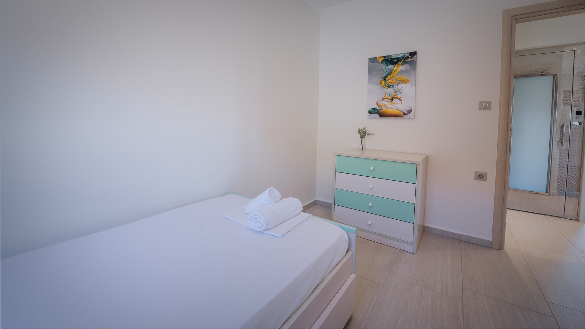This is a spacious residence of 100 sq.m. which can comfortably accommodate 8–11 people. On the ground floor of the residence there is an open-plan kitchen-living room which also leads to the large veranda. The fully equipped kitchen with dining area has everything you need to prepare meals, from breakfast to dinner, in a welcoming space that brings the family together. In the area extends a spacious and bright living room with a large corner sofa that converts into a comfortable bed, ideal for hosting additional guests. Additionally, on the same floor there are 3 bedrooms. In the first bedroom there is a double bed, while there are also 2 more bedrooms, each equipped with 2 single beds. Finally, there is also a large modern bathroom with a shower.