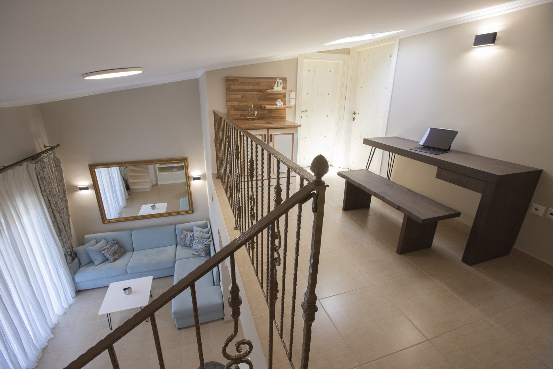 On the second floor there is a small auxiliary kitchen, as well as a comfortable workspace. Additionally, there are 2 more bedrooms, each with a double bed. Finally, on the floor there is also the second bathroom with a shower.