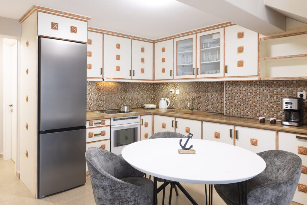 This is a spacious residence of 120 sqm which can comfortably accommodate 6–8 people. Entering the first floor of the maisonette you encounter the kitchen-living room with a dining area which is also connected to the balcony of the house. The kitchen is fully equipped with everything you need to prepare meals, from breakfast to dinner, in a welcoming space that brings the family together. In the space also extends the bright and spacious living room, which includes a large corner sofa that converts into a double bed, ideal for hosting additional guests. On the same floor there is also a bedroom with a double bed, as well as a bathroom with a shower.