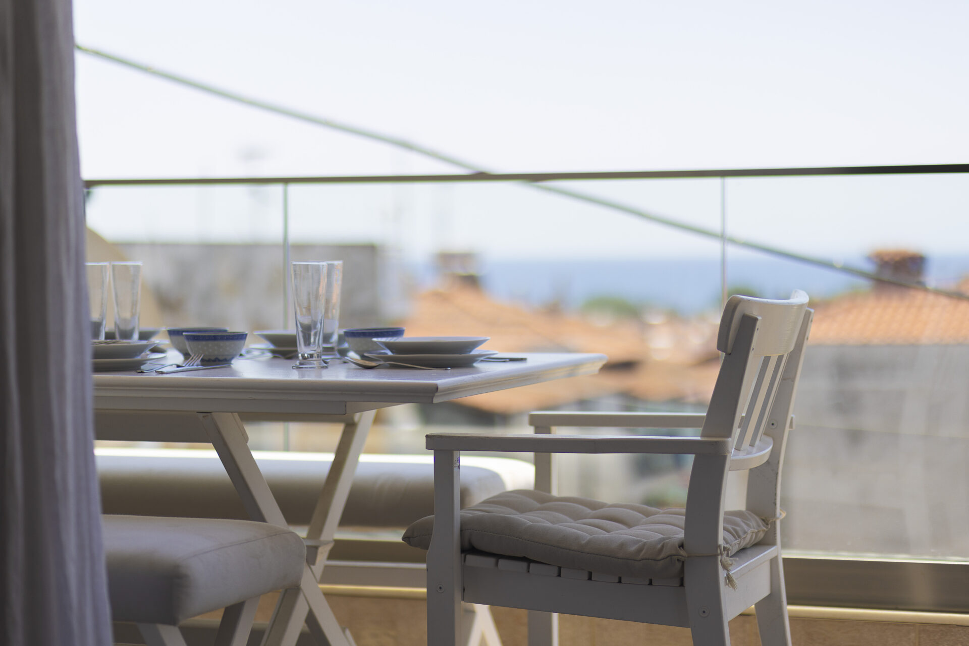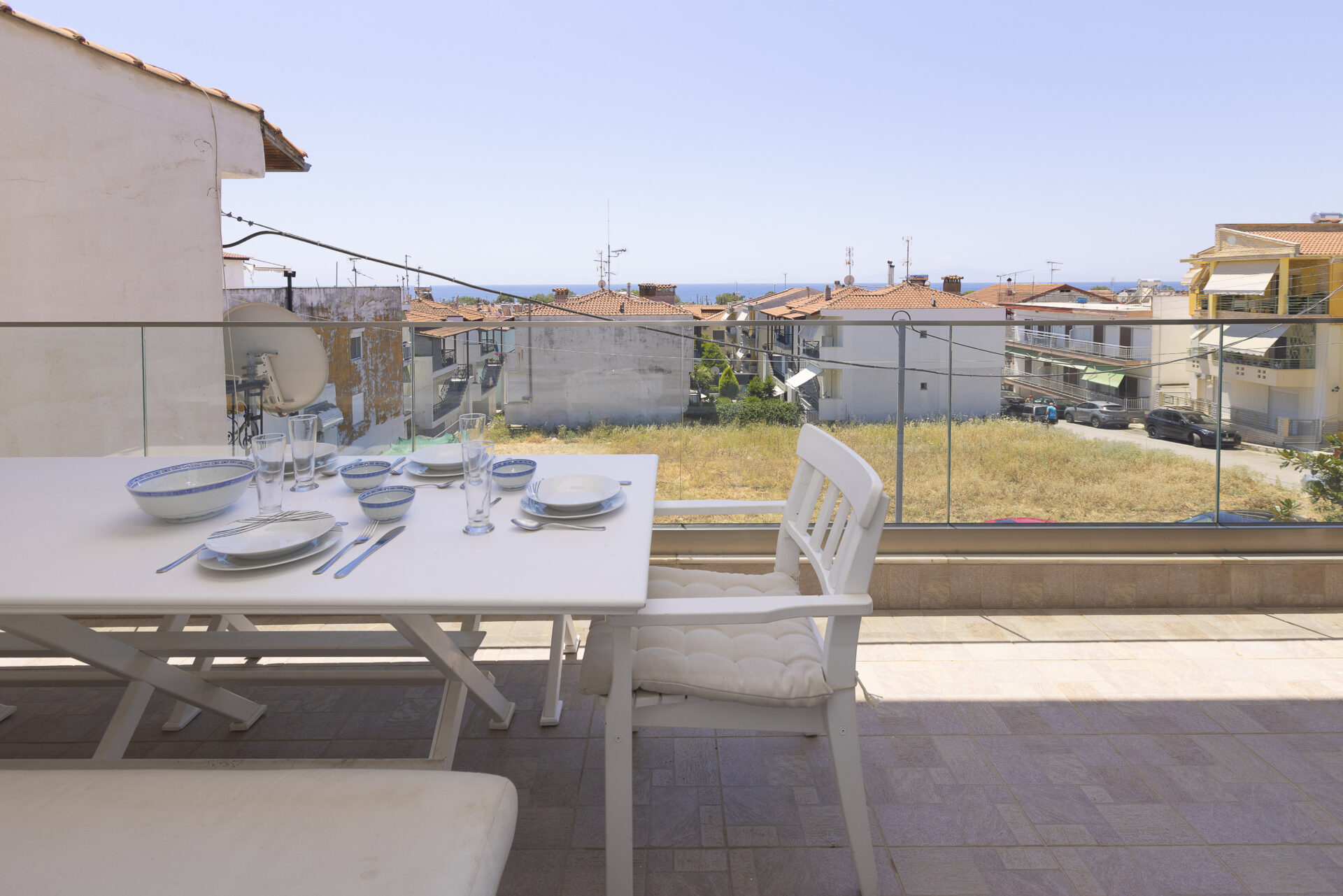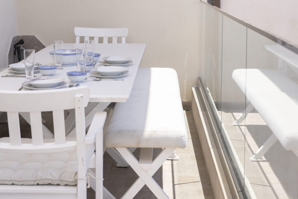 Η μεζονέτα διαθέτει ένα ευρύχωρο μπαλκόνι με μεγάλη τραπεζαρία και θέα τη θάλασσα όπου μπορείτε να χαλαρώσετε και να απολαύσετε μοναδικες στιγμές με φίλους και οικογένεια.