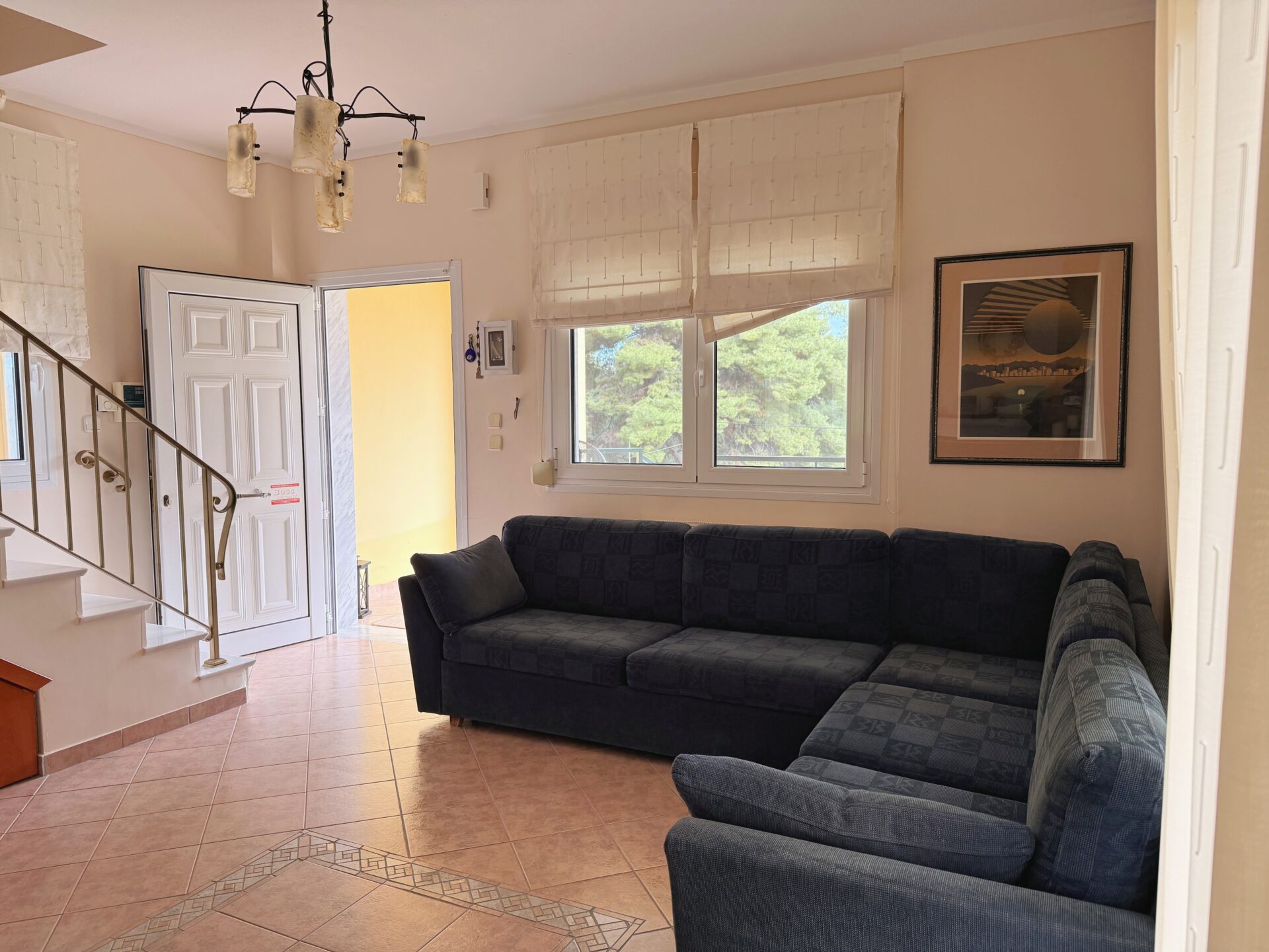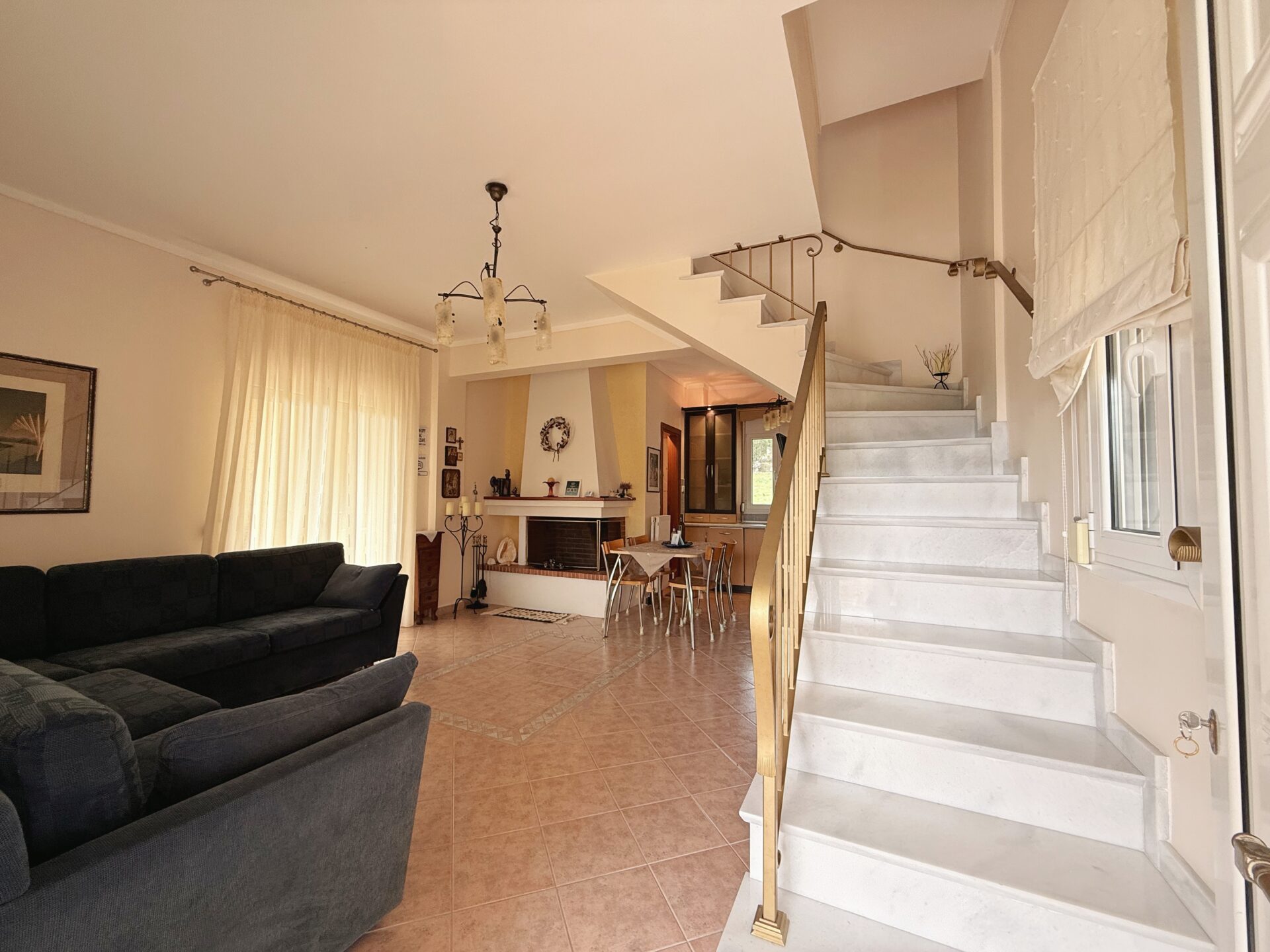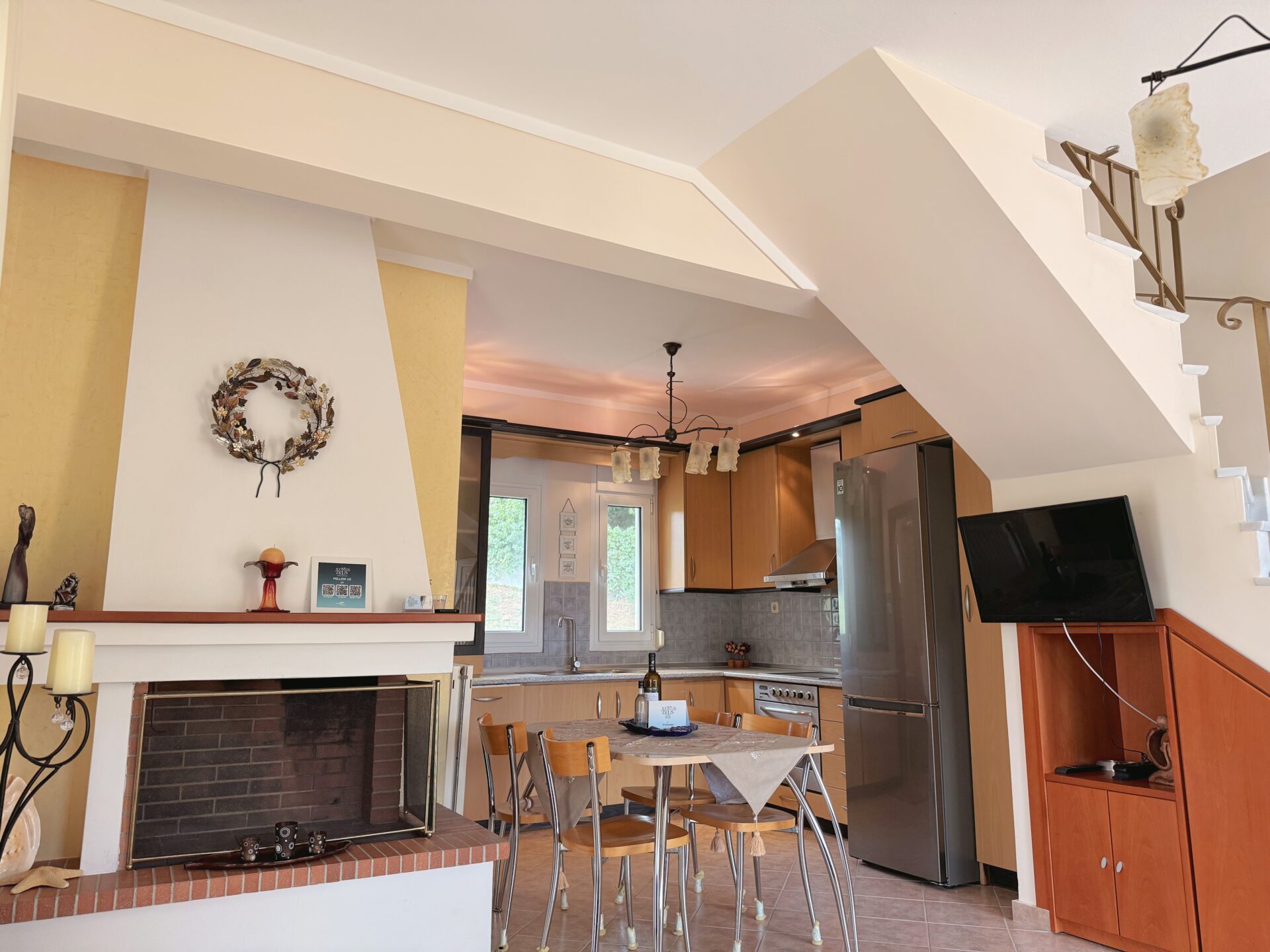 On the ground floor, you’ll find a spacious and bright living room with two comfortable sofas and a fully equipped kitchen that has everything you need to prepare your meals and enjoy cozy family dinners.