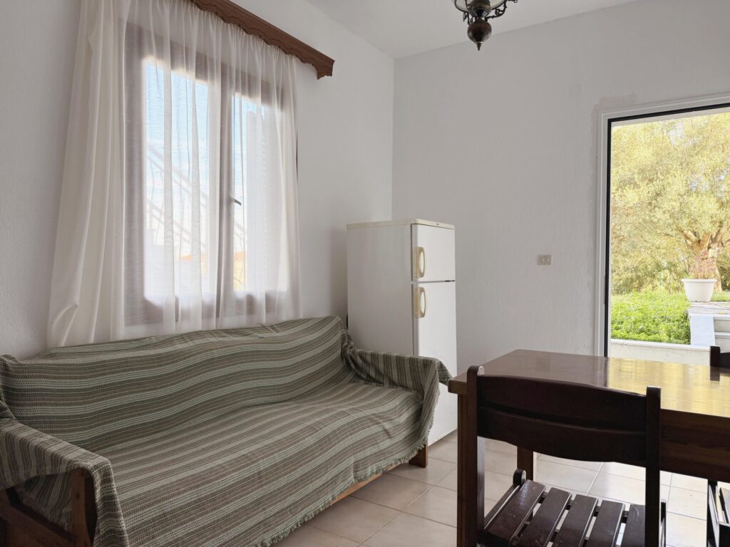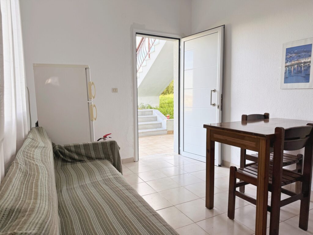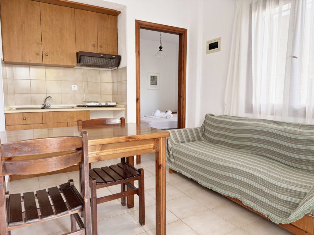 Πρόκειται για ένα studio 25 τ.μ. το οποίο βρίσκεται στο ισόγειο του κτιρίου και μπορεί να φιλοξενήσει μέχρι και 3 άτομα με άνεση. Μπαίνοντας στη κατοικία συναντάτε μια ενιαία φωτεινή σαλοκουζίνα. Η πλήρως εξοπλισμένη κουζίνα με τραπεζαρία διαθέτει όλα όσα χρειάζεστε για να ετοιμάσετε γεύματα, από πρωινό μέχρι δείπνο, σε έναν φιλόξενο χώρο που ενώνει την οικογένεια. Στο σαλόνι υπάρχει ένας άνετος καναπές που μετατρέπεται σε μονό κρεβάτι. Το διαμέρισμα διαθέτει 1 υπνοδωμάτια με διπλό κρεβάτι και ένα μπάνιο με ντουζιέρα.