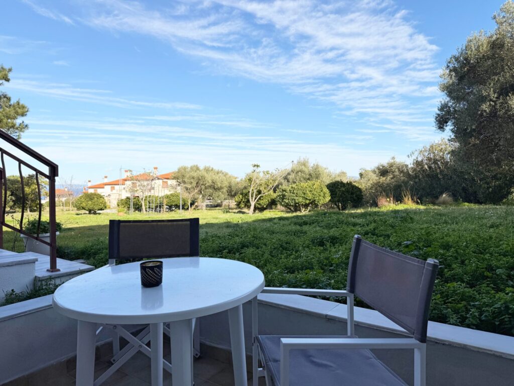 Welcome to our spacious studio, a peaceful retreat in Kriopigi, Halkidiki, ideal for unforgettable summer holidays for families or groups of adults. The studio is located on a large plot with shared ownership, which includes 3 other residences, while still maintaining privacy and comfort for families or large groups.